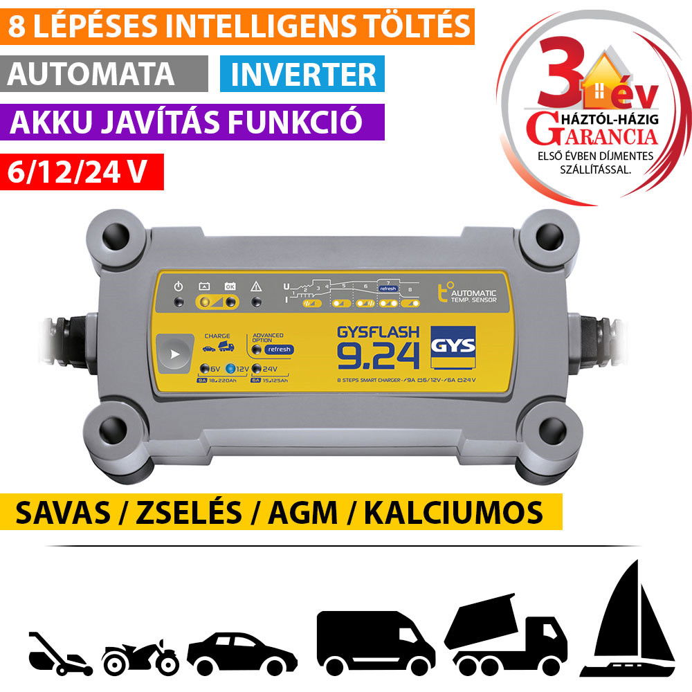 A GYSFLASH 9.24 kifejezetten az összes jármű 6, 12 és 24 V-os akkumulátorának töltésére lett kifejlesztve. 8 lépéses, intelligens töltési görbével rendelkezik, valamint «Refresh» móddal az erősen lemerült akkumulátorok helyreállítására.